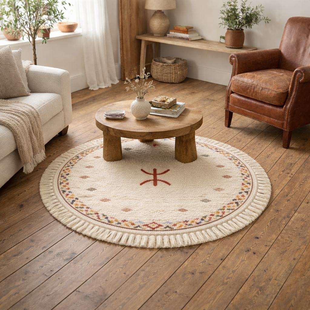 Tapis rond berbère avec symbole amazigh en laine naturelle